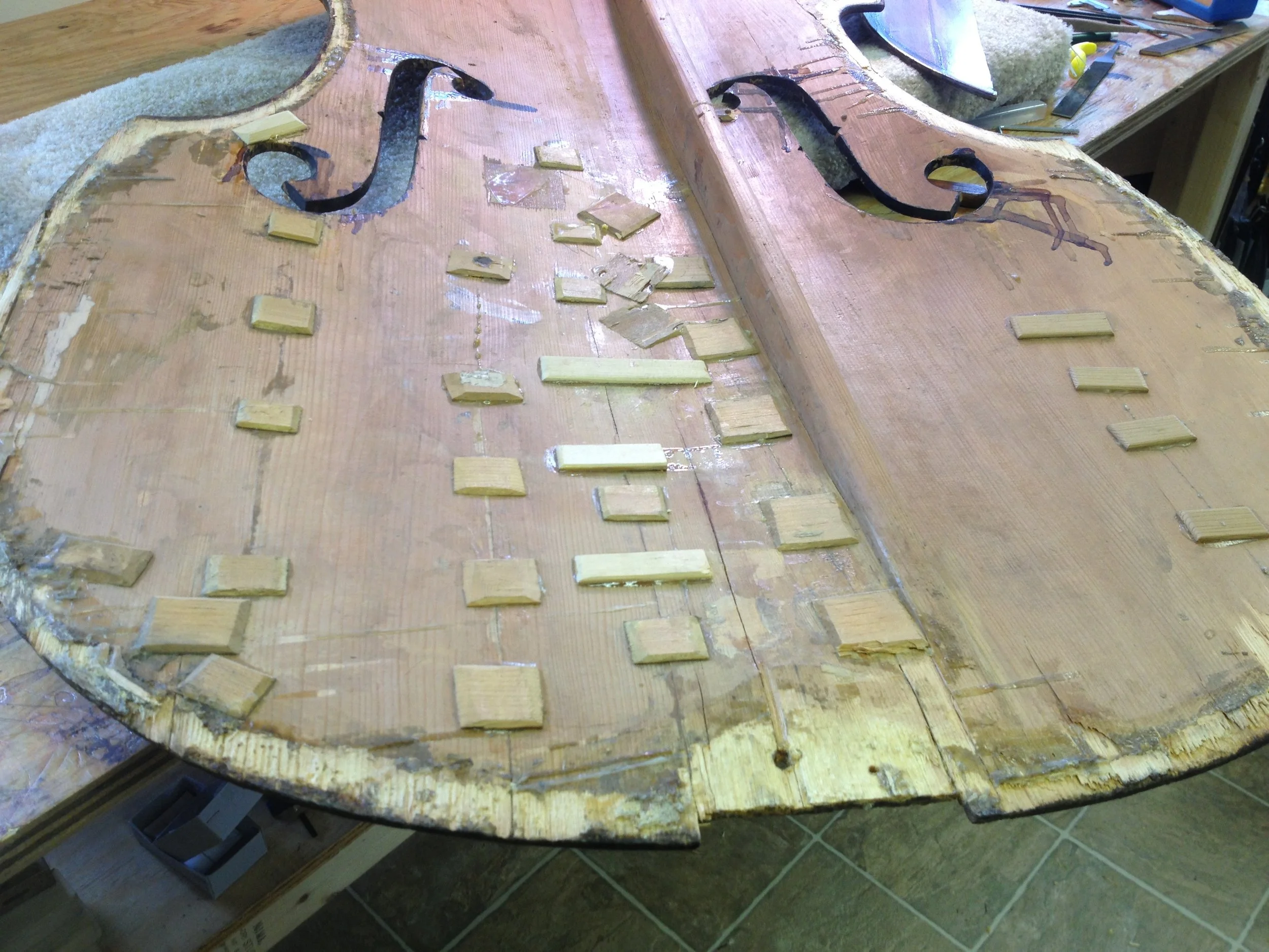 This is the inside of the top of that same fallback bass as in the previous photo. It was a total mess (see the before photo). This bass was worse off after the previous repairs, and I think some of the new cracks were the result of old repairs.